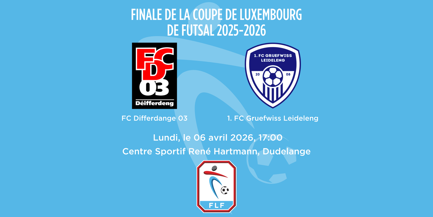 When? Monday 06.04.202617:00 FINALE DE LA COUPE DE LUXEMBOURG DE FUTSAL 2025-2026 Where? rue Nic Biever, L-3425 DUDELANGE Sport FINALE DE LA COUPE DE LUXEMBOURG DE FUTSAL 2025-2026Book©echo.luNext eventsMonday 06.04.202617:00