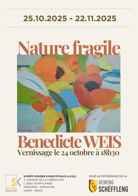 The Schëfflenger Konschthaus is delighted to invite you to the opening of the retrospective ‘Nature fragile’ by Benedicte Weis, an artist who sensitively celebrates the beauty and vulnerability of life through her paintings and sculptures.