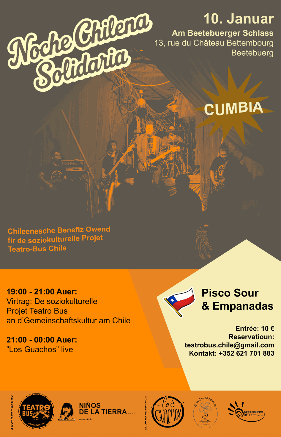 When? Saturday 10.01.202619:00 - 23:45 soirée chilienne - Noche Chilena solidaria Where? 13, rue du Château, L-3217 BETTEMBOURG Gastronomie, Music Festivals, Training/Conferences Solidarity Evening: Cumbia, Empanadas, Pisco Sour, Presentation of the Sociocultural Project TEATROBUS©echo.luNext eventsSaturday 10.01.202619:00 - 23:45