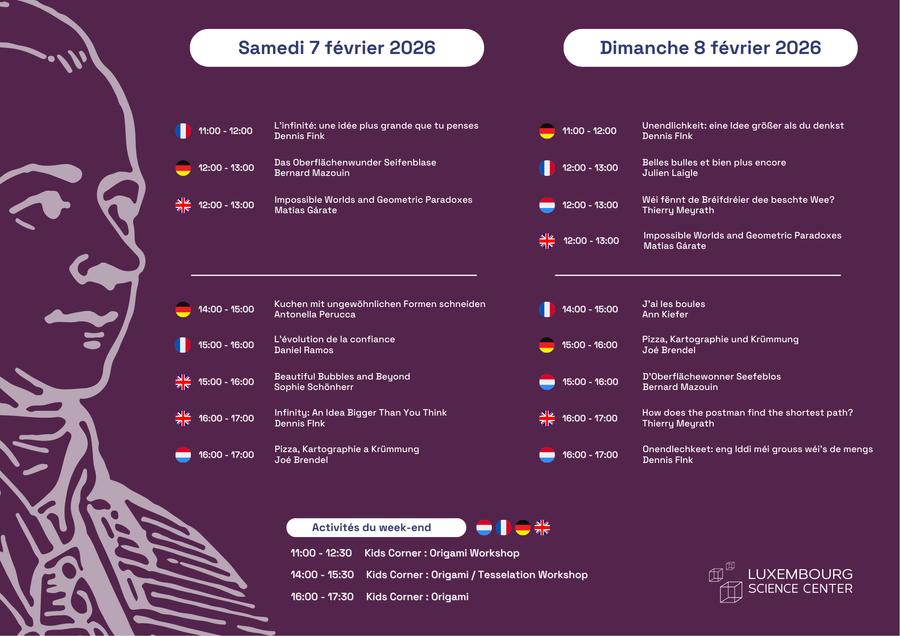 - WORKSHOP : Beautiful Bubbles and Beyond – "Des bulles de savon peuvent prendre des formes inattendues" (Bernard Mazouin, Sophie Schönherr, Julien Laigle – Luxembourg Science Center) – FR, LU, DE & EN