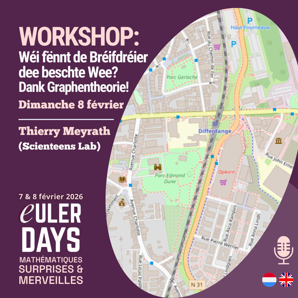 - WORKSHOP : Wéi fënnt de Bréifdréier dee beschte Wee? Dank Graphentheorie ! – "En Abléck an d'Berechnunge vun Navigatiounssystemer." (Thierry Meyrath – Scienteens Lab) – LU & EN