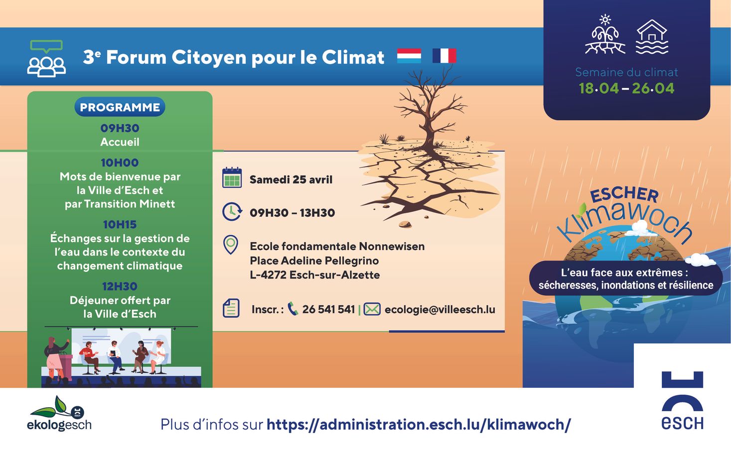 C'est pourquoi la Ville d'Esch – avec Transition Minett – vous invitent à participer au 3e Forum Citoyen pour le Climat avec pour thématique l'eau face aux extrêmes : sécheresses, inondations et résilience.