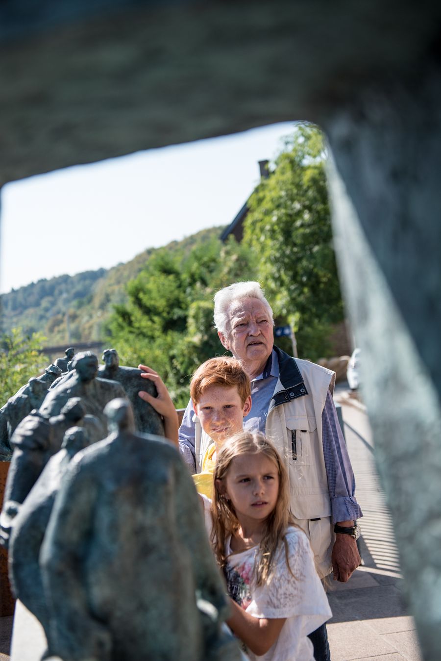 The sculpture shows Italian immigrants, carrying their suitcases and crossing the "Porte d'Italie", the bridge symbolically separating the "Italian" district from the center of the city. On the other side of the gate they are welcomed by a family. On the base the Italian and Luxembourgian text of Matthew 25:35: Ero straniero, e mi avete accolto - "I was a stranger and you welcomed me."