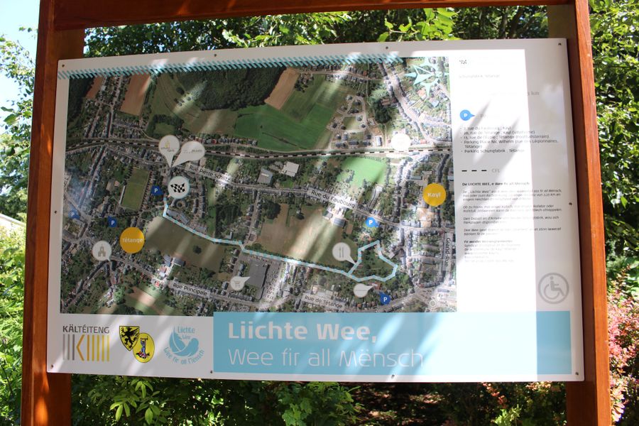 The 'Liichte Wee' is a path that is accessible for everybody, regardless on foot, with a stroller, a rollator or wheelchair. The starting point and arrival are at the 'Schungfabrik' in Tétange, where you can also find handicapped-accessible parking spaces.